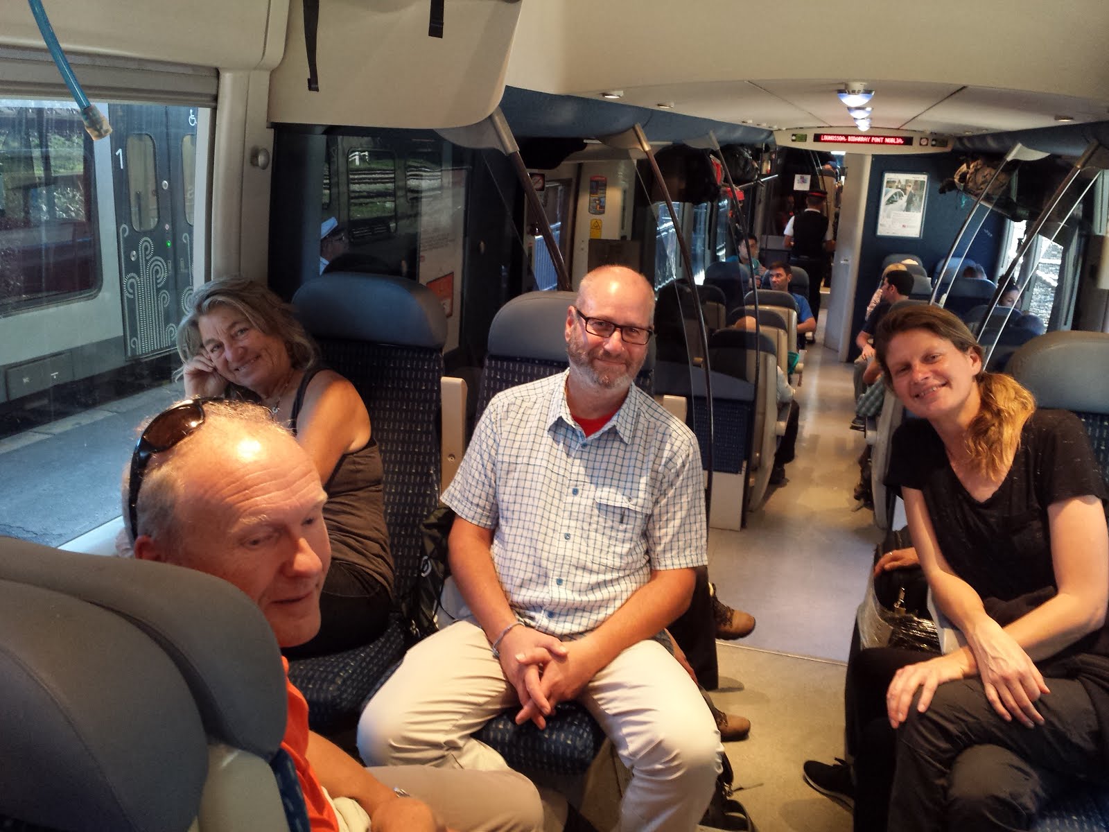 | From R to L: Ditte, Stefen, David, Linda on the train from Bayonne to St. Jean Pied du Port |