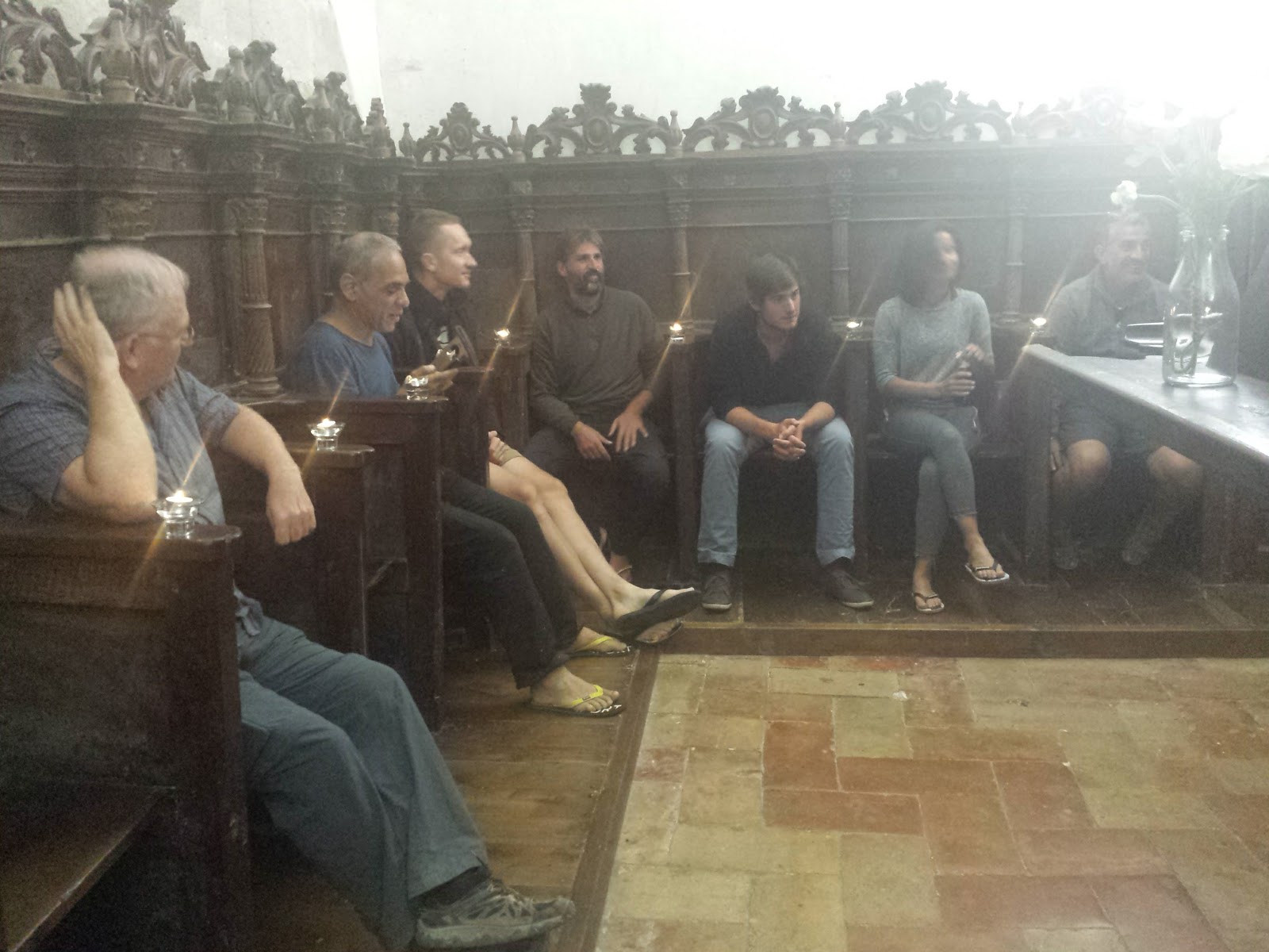 The cook led the way into our bedroom where an unnoticed door was now open. It led to the balcony in the church. I realized the laundry room was right above us. The elaborate gold carved wall behind the altar below was lit up while all else was dark. The balcony had 30 carved wooden thrones built into the walls each with arms on which a small lit candle flicked. Once we were all in the lights dimmed and the young Italian woman who had greeted us at dinner, spoke about the tradition of passing a candle from person to person. Whoever held the candle could share, in whatever language they chose, a story, an experience, a wish, a dream. And so the candle was passed from the person. It was a very magical time.