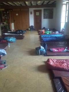 Last night was very different. We are staying in the 15th C. church, up a small stone staircase past a window which showed the two feet thick walls and in a room @20’x 30′ built onto the side of the church and into the attic. There are 14 thin mattresses on the floor. In the attic is another 10 mattresses, and down below at ground level are 8-10. The laundry room is in the attic and up some rickety stairs into a dusty, cobwebbed area above the dome ceiling of the church. You could see the dome below. Dinner was cooked by an Italian man assisted by many volunteers. The Knave, his Jester and The Viking were there too.