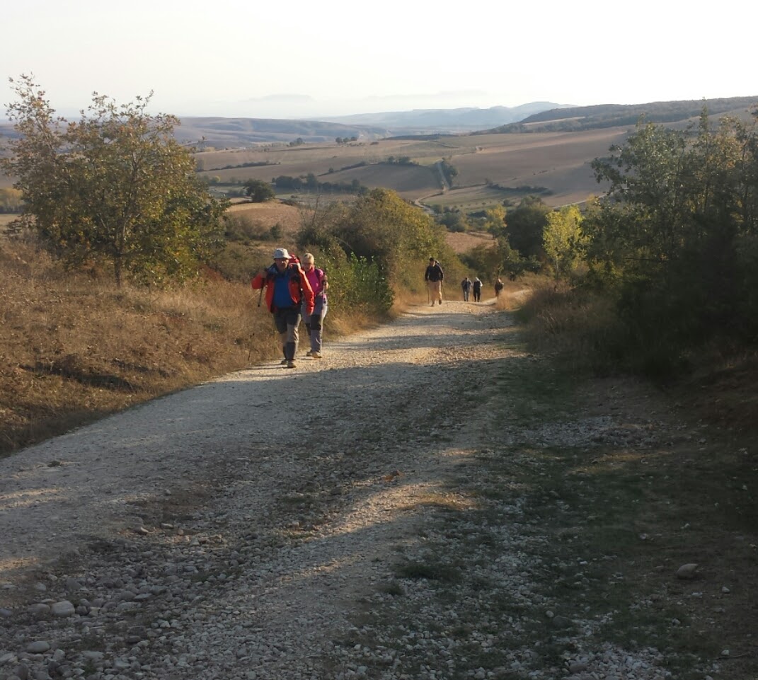 We got up early and were walking by 6:45 – in the dark. Even so, we were almost the last to leave the albergue. Again. Sleeping in, while sleeping in a room of 16 beds is impossible especially when the door squeaks loudly every few minutes after 5 o’clock as another person left. Why can’t they all leave at once? Linda wondered why people rush out the door in the dark and don’t stop to smell the roses, and I agreed, but a while later while walking, I realized there were many different types of roses. There is the rose of walking by moonlight and seeing your moon shadow. There is the rose of walking under the stars, the rose of seeing the sunrise and the rose of early morning light on the hills.
