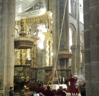 But time was marching ahead. We had planned to be sitting in the Cathedral before 11:30, time enough we hoped, to get a seat for the noon mass. But even being 30 minutes early, the pews are all taken. I managed to step up on a pillar and hang on by my feet. All saints day was one of the days that they use the Botafumeiro (incense sensor) which weighs over 50kilograms when empty and another 10k when filled with incense and burning coal. It is lowered from the ceiling and lit, then raised and swung above the crowds of sweating, smelly pilgrims to cleanse them and sweeten the air. It takes 8 men to help raise and put the Botafumeiro into motion, in a 65 meter arc swinging it from one end of the church to the other. God help them if the rope breaks.