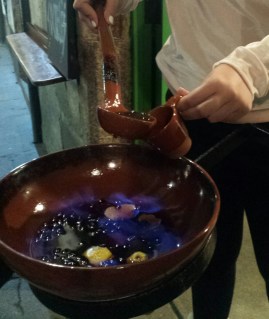As we left the restaurant we took a shortcut down a narrow alley way and I spotted a bowl of Blue Fire flickering outside a bar. We peered into it and didn’t hesitate when a waitress appeared and offered us glasses at €3 each, but refills were free! I asked about the incantation that would provide the spell needed for purification but she appeared mystified and a waiter who knew more about it said we needed ten people for the ceremony, so we stuck with drinking it and hoped for the best.