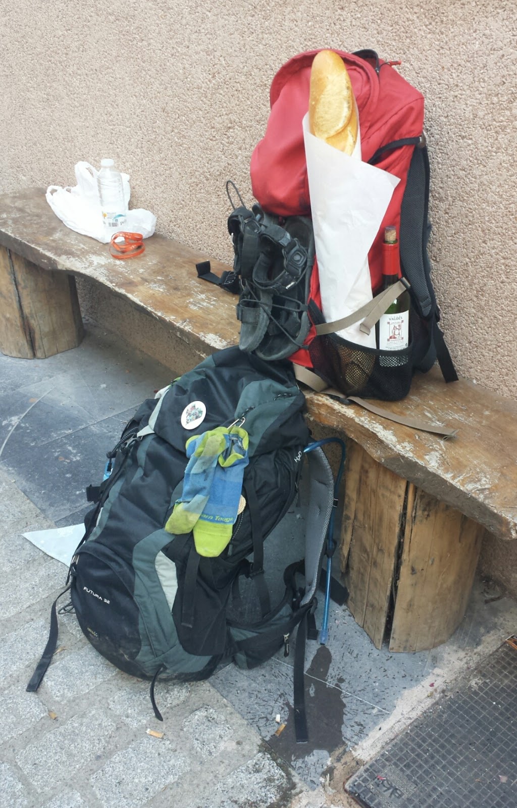 Top: Mats pack with wine and baguette. Bottom: my pack with socks drying and pack peeing. |