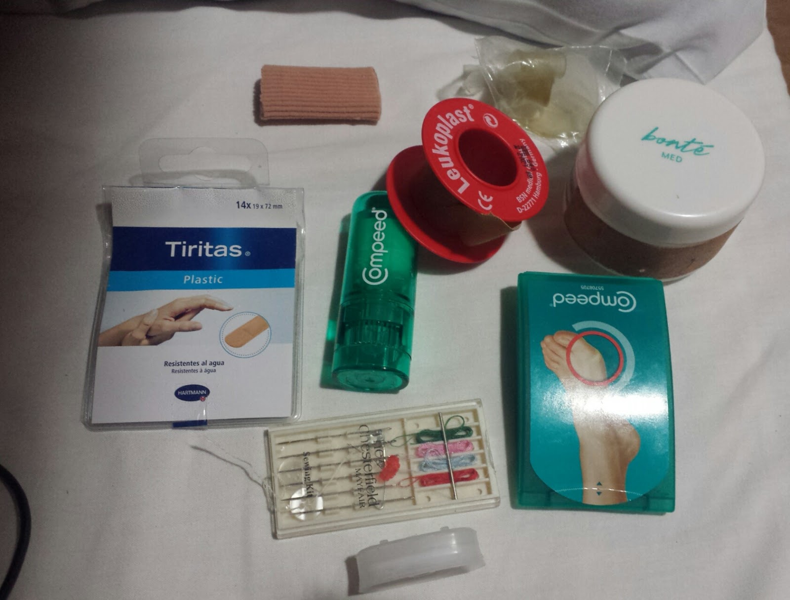 Foot care kit: bandaids, toe socks, body glide, toe spacers, tape, Vaseline, Compeed second skin blister pads, pre-threaded needles. |