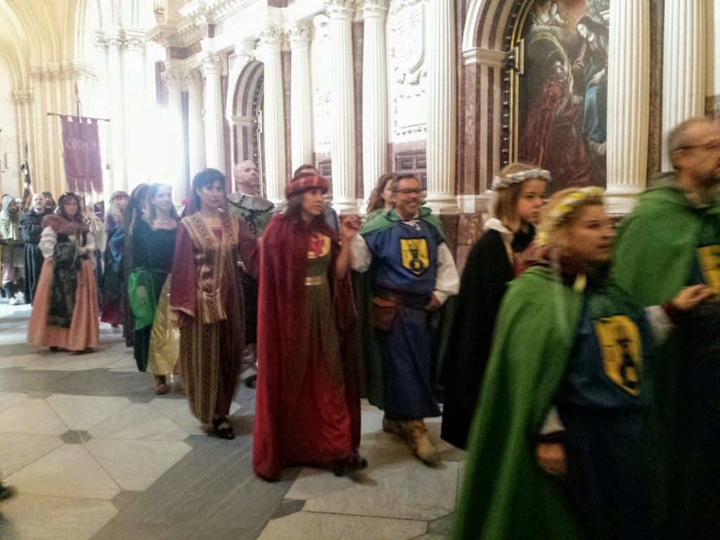 The cathedral bells were ringing, calling me so I hustled over the bridge into the main gate and saw a crowd gathering in the square below the main entrance to the cathedral. I went up the stairs to get a good view and saw a procession of knights and knaves, lords and ladies, entering the cathedral. I saw a side door and walked through and was able to take some photos. It was an amazing sight. The cathedral was filled with the gentry.