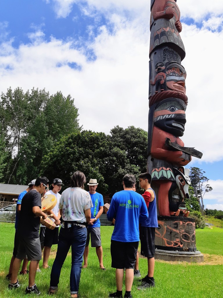 The pole points south overlooking one of the highways. It is protected by four Maori guardian poles. Four of our youth are Hesquiaht. They have been diligently practicing a song a gifted to them by two of the boys’ father. A cousin of the brothers will become a hereditary chief when he turns 21. They bring their drums and form a circle. Ruby turns to one shy youth standing next to her ‘You’re Hesquiaht, aren’t you”? “Yes” he replied and went to stand by his totem. They drummed and sang. Two of these youth had a hard time speaking in public when we started. You couldn’t tell that now.