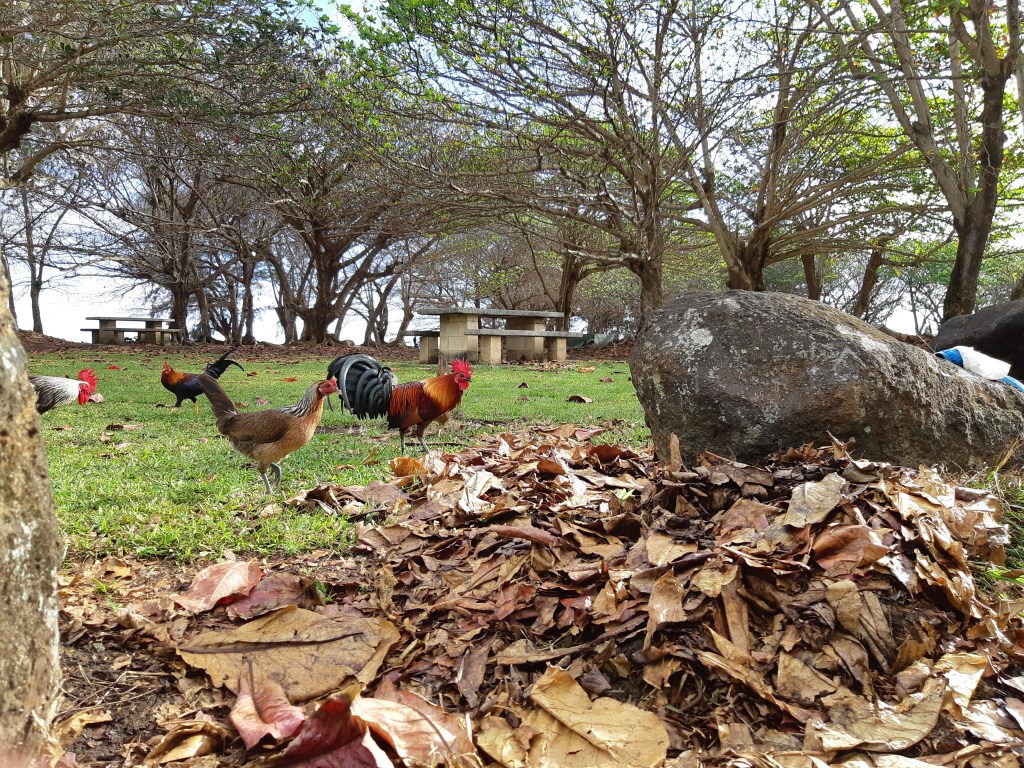 Last night was a lesson in the world of chickens. As dusk approached, the head honcho roosters made their way to a tree with a large, wide branch structure and hoped and flapped up into the canopy, at which point they let out a cockadoodledo as if to say ‘Everybody to bed.’ This scenario was repeated, cockadoodledo, throughout the campground, cockadoodledo, as the various groups invaded the trees, cockadoodledo. I didn’t see any moms with chicks, I suspected they hid in the bushes across the road. Cockadoodledo. You get the picture.
