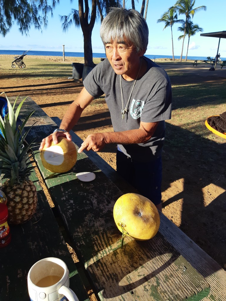 The day started with meeting Roland, a local who invited us to share a pomelo with us or perhaps more accurately to show us how to crack it open to eat it. It is like a giant grapefruit but sweeter. Roland showed us and then he was off to Waimea days to go to the rodeo.