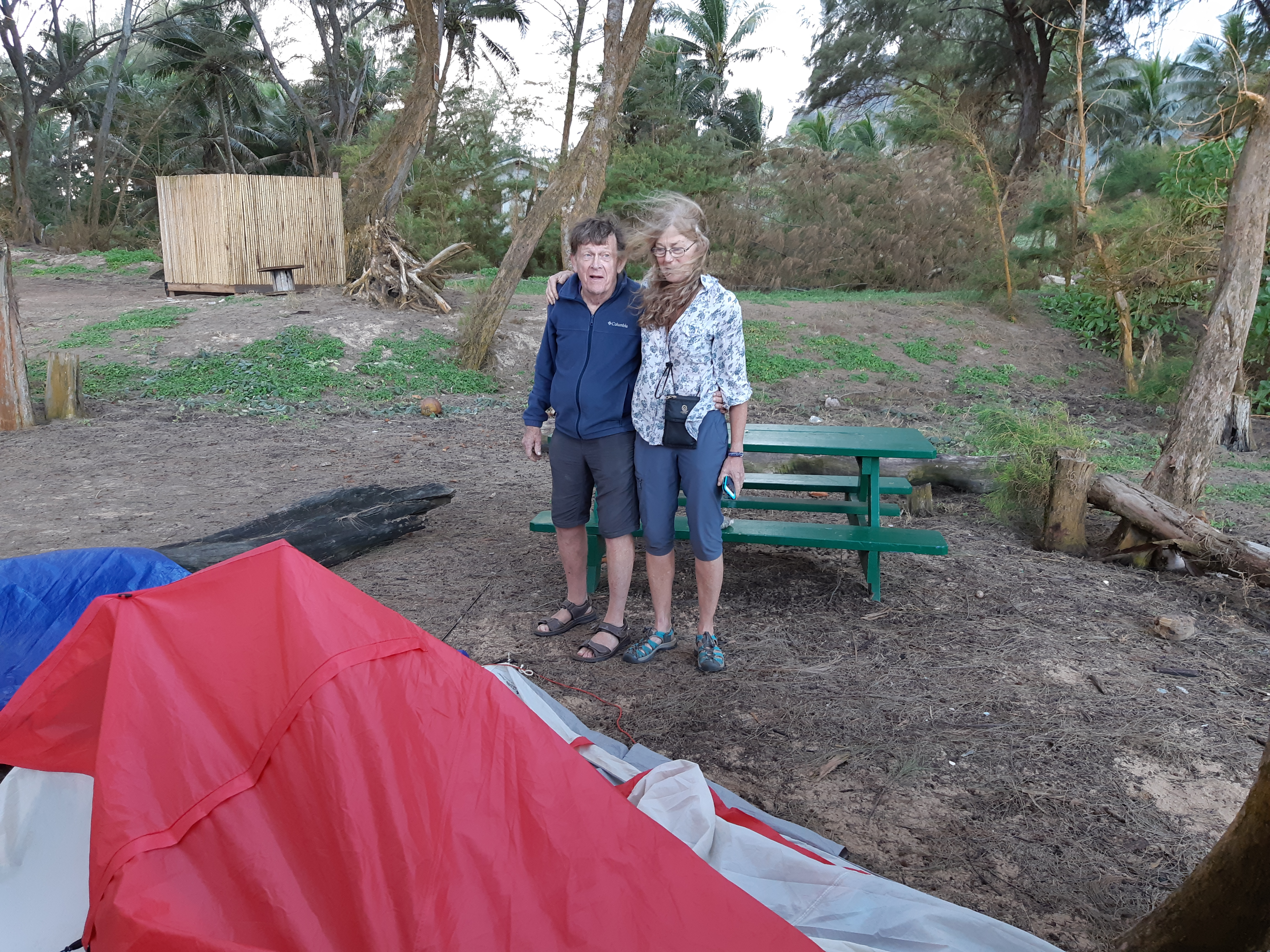 We arrived in a windstorm and parked the van between the beach and a bamboo wall used to protect tents from the winds. Trudy is keen to stay in the tent rather than the van. Three in a van works beautifully but it does heat up. We look at the 40% chance of rain tonight forecast and Ian and I try to persuade her that the van might be a better option but no. So we set up the tent and prudently throw a tarp on top. It doesn’t quite cover the tent and practically flattens the tent. Trudy tells us how Wayne would do it. Wayne runs the horseback trips in northern BC that Trudy goes on. ‘He would add a line above the tent just so here and that would hold the tarp up off the tent.’ That may be but we only have one 12ft line, a 6ft beach salvaged faded line, a shoe lace and a foot of blue ribbon. We try alternative tie ups only to see the tent sink lower and lower. We admit defeat and retire to the van.