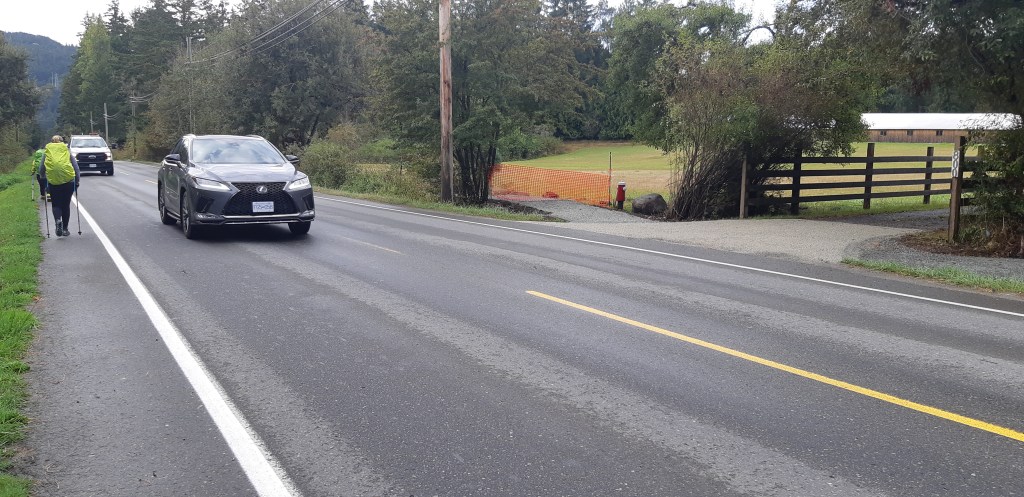 Then the narrow shoulder. We try to walk on the left so we can face death in the eye but sharp corners are a problem where the oncoming cars can’t see you as the come around the tight corner, so sometimes we walk with our backs to traffic to get around a corner.